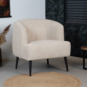 Matmenys: plotis x gylis x aukštis, 74 cm x 52 cm x 77 cm.Sėdynės aukštis: 44 cm. Sėdynės storis: 23 cm.Medžiaga: bukle audinys (poliesteris)/ metalas.Spalva: smėlio.Tiekėjo šalis: Olandija.Fotelis pagamintas iš bukle audinio. Audinys turi 100 000 Martindale balų, o tai reiškia, kad audinys yra labai patvarus.