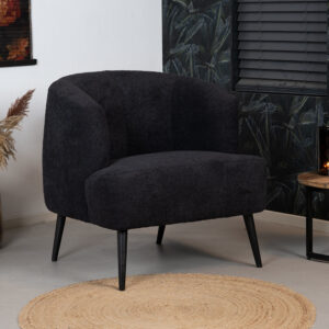 Matmenys: plotis x gylis x aukštis, 74 cm x 52 cm x 77 cm.Sėdynės aukštis: 44 cm. Sėdynės storis: 23 cm.Medžiaga: bukle audinys (poliesteris)/ metalas.Spalva: juoda.Tiekėjo šalis: Olandija.Fotelis pagamintas iš bukle audinio. Audinys turi 100 000 Martindale balų, o tai reiškia, kad audinys yra labai patvarus.