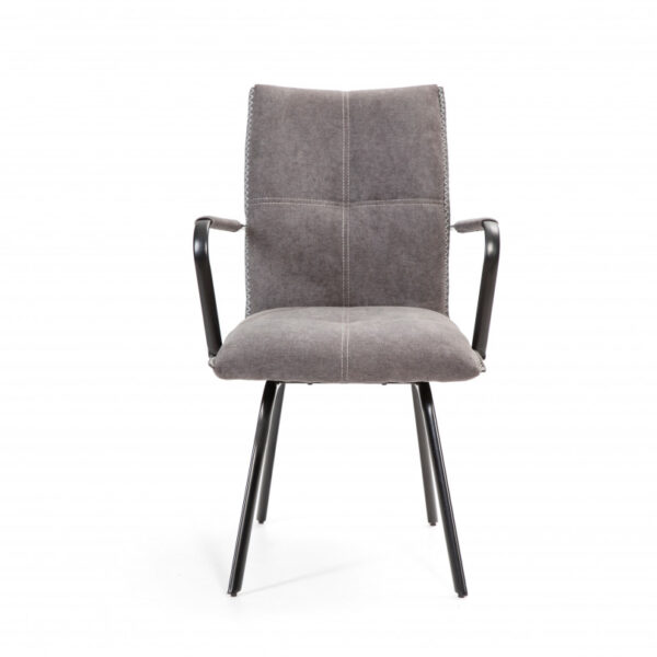 Matmenys: 56 cm x 58 cm x 84 cm (plotis x gylis x aukštis)Sėdynė: 45cm x 44cm x 49cm (plotis x gylis x aukštis)Atlošo aukštis: 39cmPorankio aukštis: 17cmSpalva: pilka Medžiaga: mikropluoštas ( 100% poliseteris), metalinės kojos.