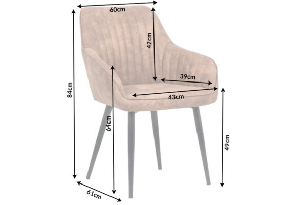 Matmenys: 56 cm x 58 cm x 84 cm (plotis x gylis x aukštis)Sėdynė: 45cm x 44cm x 49cm (plotis x gylis x aukštis)Atlošo aukštis: 39cmPorankio aukštis: 17cmSpalva: pilka Medžiaga: mikropluoštas ( 100% poliseteris), metalinės kojos.