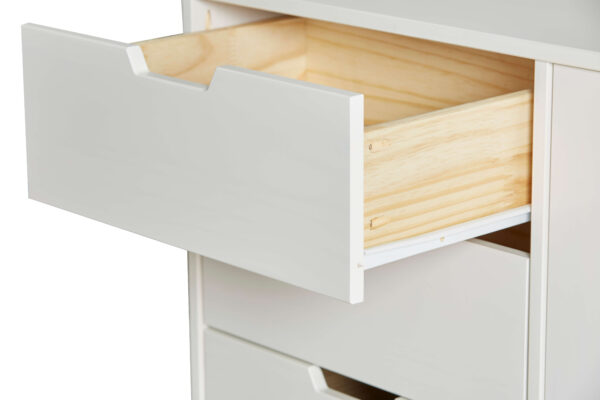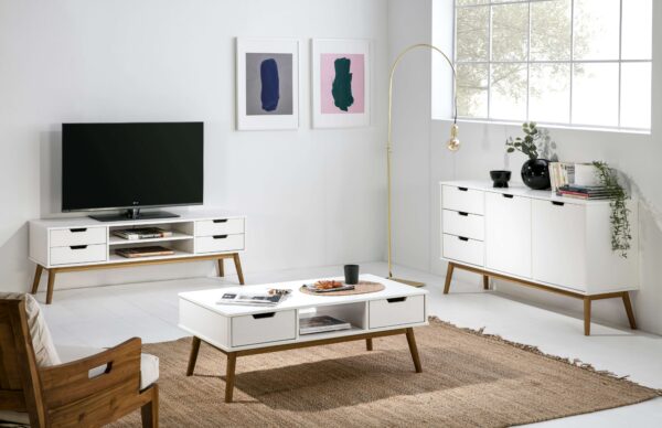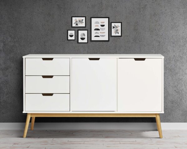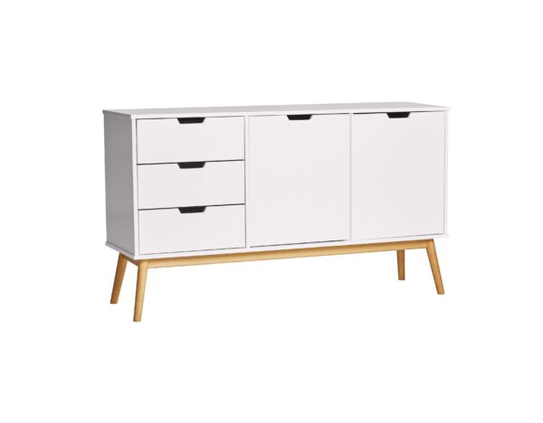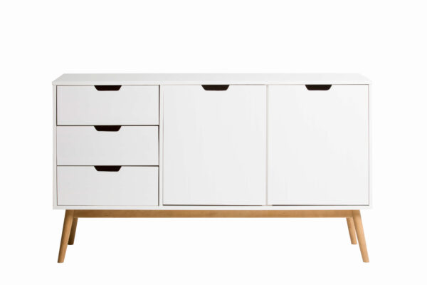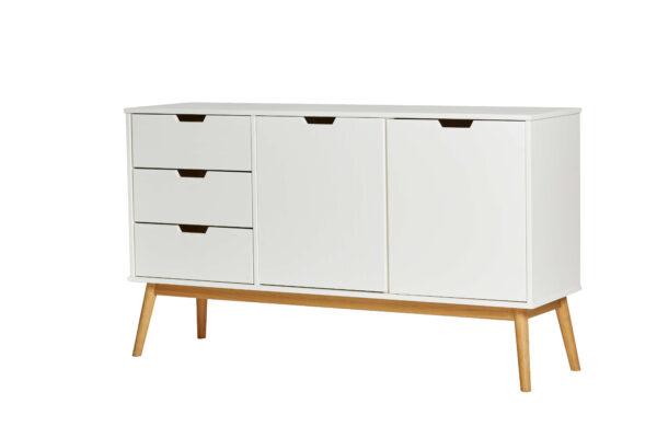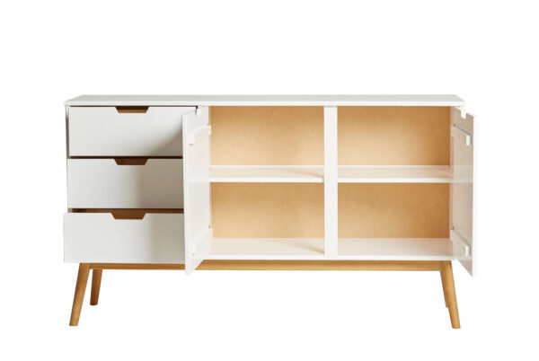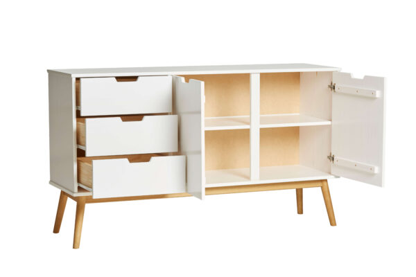 Medžiaga: korpusas su vidiniais stalčiais lakuotas MDF, vidinės lentynos - MDF. Kojos: medžio masyvo lakuotos. Niša: MDF faneruota natūraliu ąžuolu.