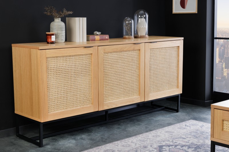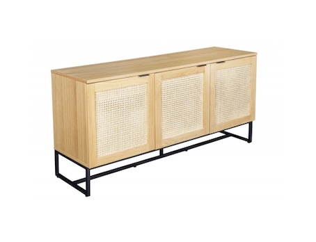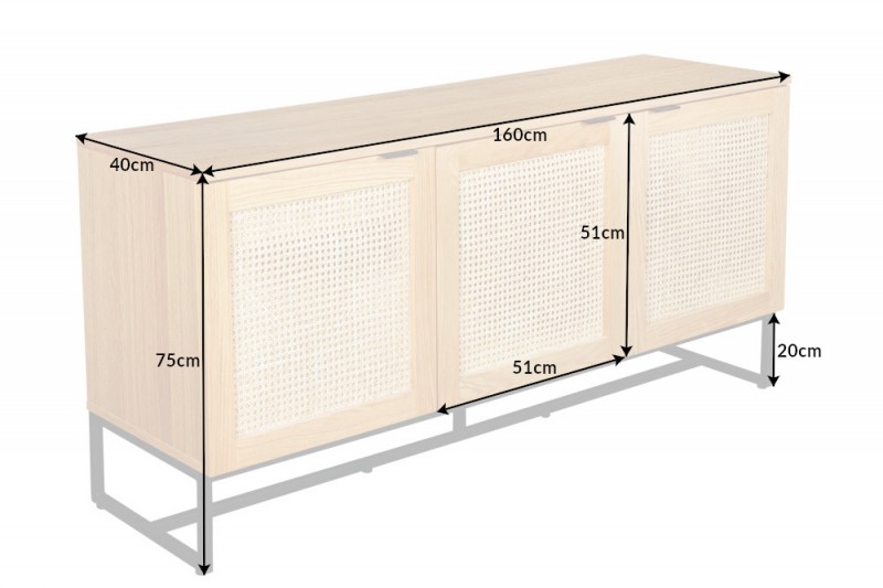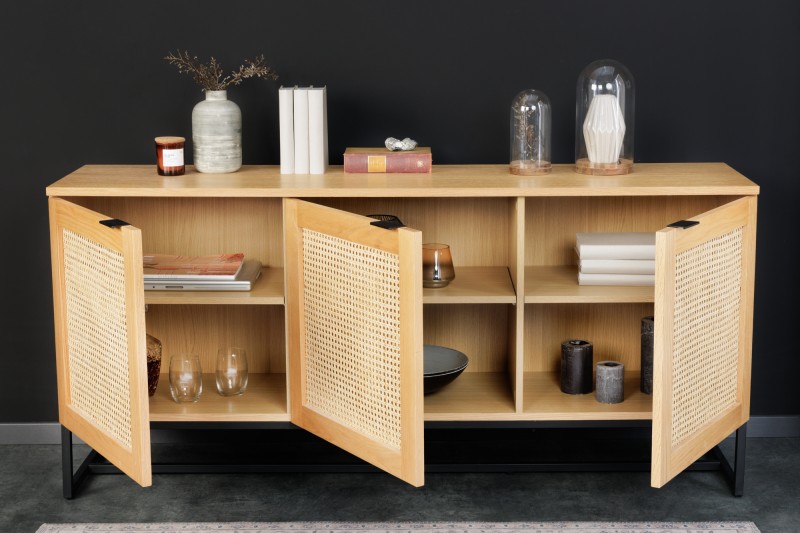 Matmenys: plotis x gylis x aukštis, 145 cm x 45 cm x 79 cm.Viršutiniai skyriai: 2 - 43cm x 32,5 cm x 34 cm .Žemiau esantys skyriai: 2 - 43cm x 35,5cm x 34 cm .Medžiaga:  Sheesham medžio masyvas ,  lakuotas.  Kojos - metalinės.Spalva: ruda