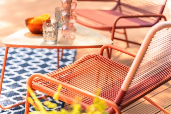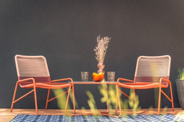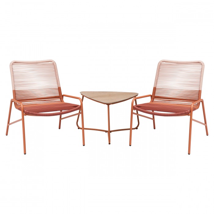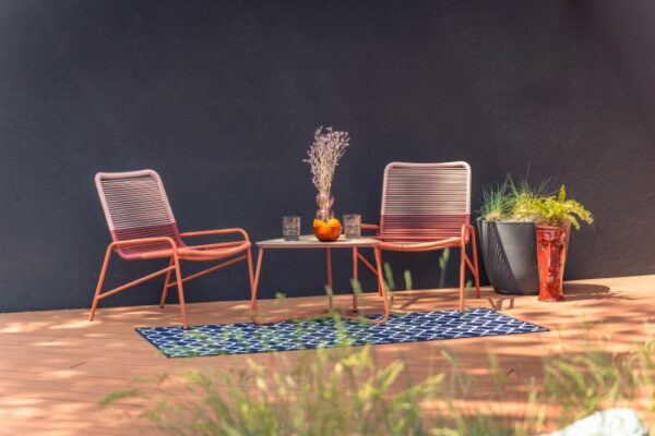 Kompaktiškas baldų rinkinys – tai baldai, kuriuos galima sėkmingai pastatyti net ir mažame balkone. Nedidelį komplektą 2 žmonėms sudaro 2 kėdės ir stalas. Unikali viršutinės dalies forma ir originalaus dizaino kėdės dera prie dabartinių interjero dizaino tendencijų. Plieninis karkasas apsaugo nuo galimų deformacijų ir turi įtakos baldo stabilumui.Kėdžių sėdynės ir atlošai pagaminti iš polirotango, kuris puikiai tinka naudoti lauke. Jis pasižymi padidintu atsparumu UV spinduliuotei ir lengvai valomas nuo nešvarumų.