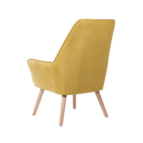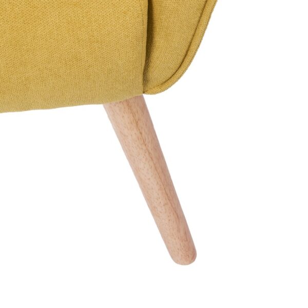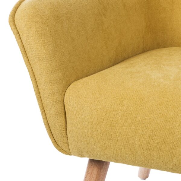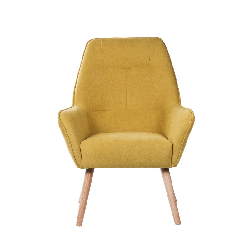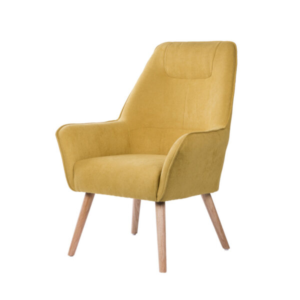 Patogus fotelis, švelnaus audinio, su šiek tiek pasvirusiomis kojomis iš natūralios medienos. Jo atlošas yra aukštas, užtikrinantis didesnį komfortą. Šis fotelis idealiai tinka atpalaiduojančioms akimirkoms bet kuriame namų kambaryje.