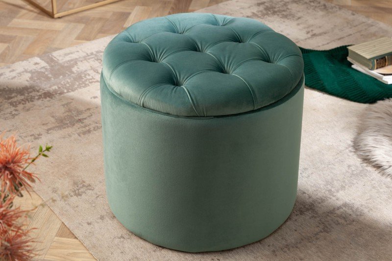 Šiek tiek blizgantis aksomas elegantiškas, bet tuo pačiu ir traukiantis akį, dėl Česterfieldo siuvinėjimo Pufas/daiktadėžė tinkamas ir prisėsti ir susidėti daiktus.
