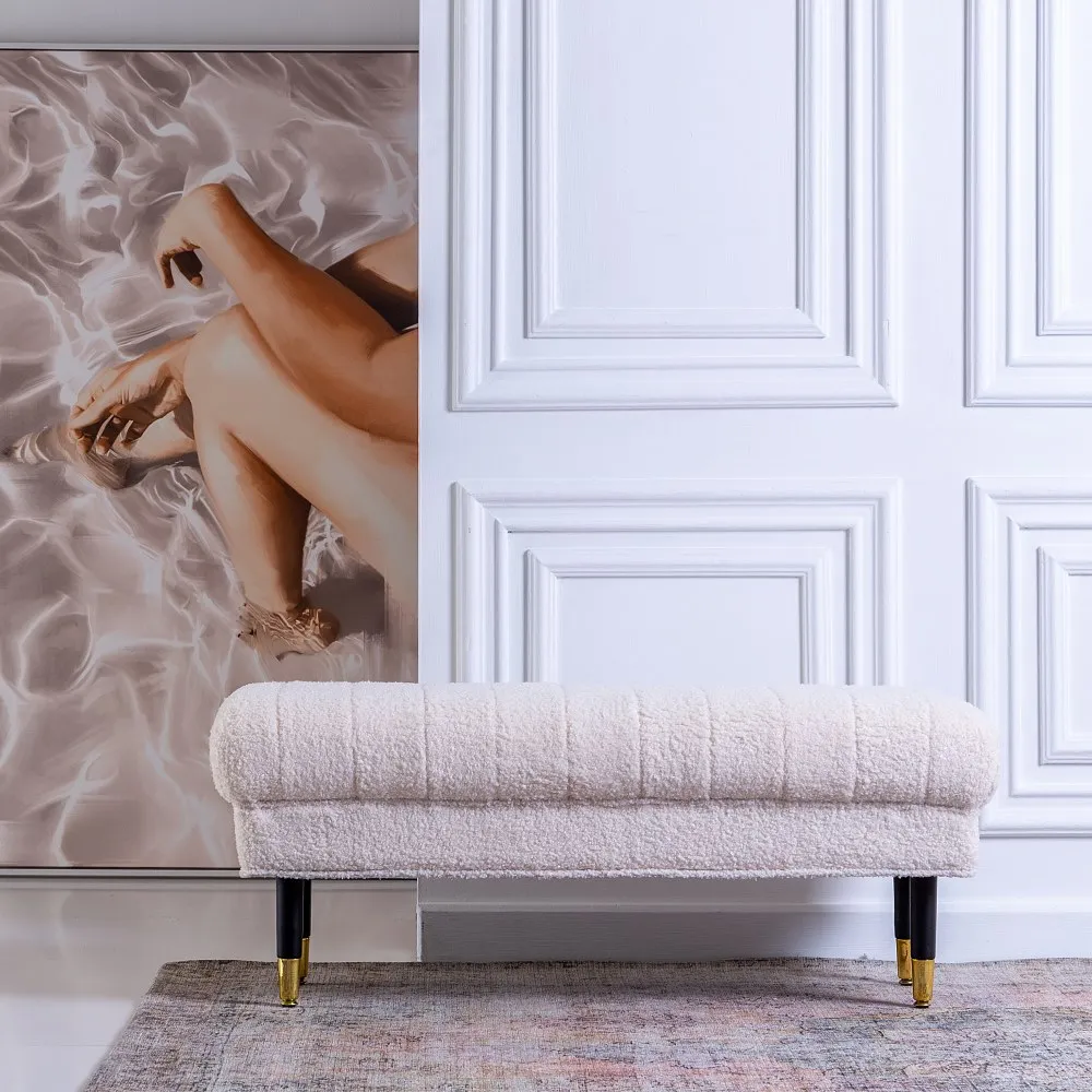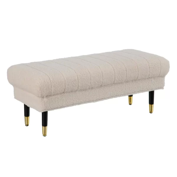 Suoliukas.Matmenys: plotis x gylis x aukštis, 90 cm x 30 cm x 56 cm Spalva: kreminė.Medžiaga: linas, medžio masyvas.
