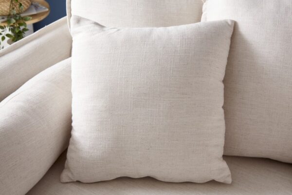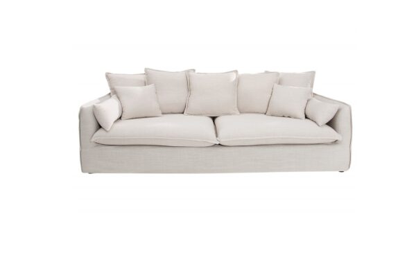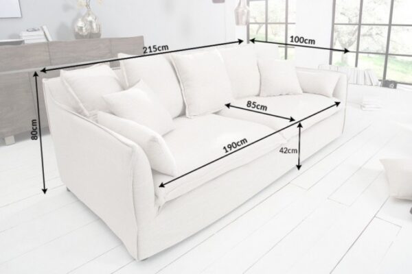 Matmenys: plotis x gylis x aukštis, 247 cm x 105 cm x 81 cm.Sėdynės aukštis: 43cm. Sėdynės gylis: 57/79 cm. Ašies plotis: 202 cm.Medžiaga: tekstūruotas audinys (100% poliesteris), metalas.Spalva: kreminė/aukso.