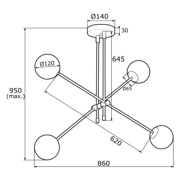 Mondo galima rasti šviestuva interjerui.Išmatavimai: 120 x 120 x 130 cm.Medžiaga: metalas, stiklas.Spalva: juoda, balta.Šviesos taškų skaičius: 6.Aukščio regullevimas: NE.„Galia“ (W): 10.Maksimalus ilgis: 130 cm.