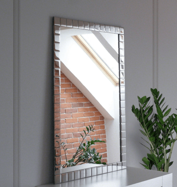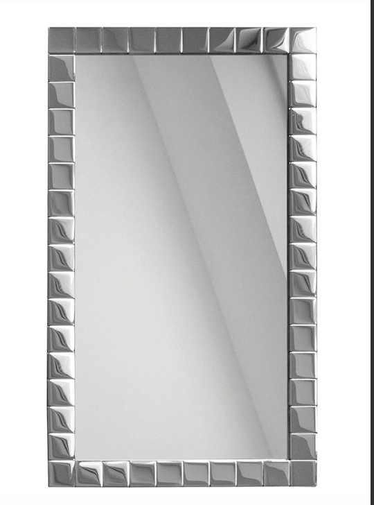 Elegantiškas dekoratyvinis vonios veidrodis baltame rėme, papuoštas sidabro stiklo mozaikašorinis matmuo: 60 × 90 cm. Pačio veidrodžio matmenys: 45 cm × 75 cm. Galimos rėmo spalvos: balta, juoda ir ruda. Galite užsisakyti veidrodį individualiems matmenims.