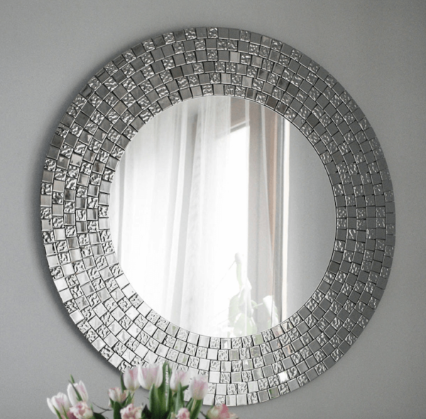 Elegantiškas didelis apvalus veidrodis sidabriniame rėmelyje, pagamintas iš šešių eilių stiklo mozaikos. Itin dekoratyvus rėmas gražiai papuoš interjerą klasikiniu ir puošniu stiliumi.