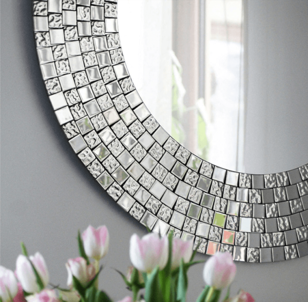 Veidrodžio rėmas pagamintas iš aukštos kokybės sidabro stiklo mozaikos. Jame įstrigo blizgus, poliruotas veidrodis.