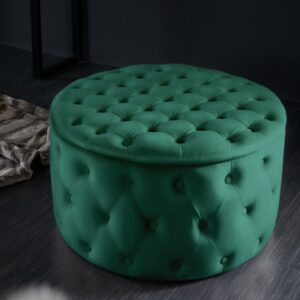 Šiek tiek blizgantis aksomas elegantiškas, bet tuo pačiu ir traukiantis akį, dėl Česterfieldo siuvinėjimo. Pufas/daiktadėžė tinkamas ir prisėsti ir susidėti daiktus.Spalva: žalia.Matmenys: Ø 75 x 44 cm.Sudėtis: aksomas (100% poliesteris).